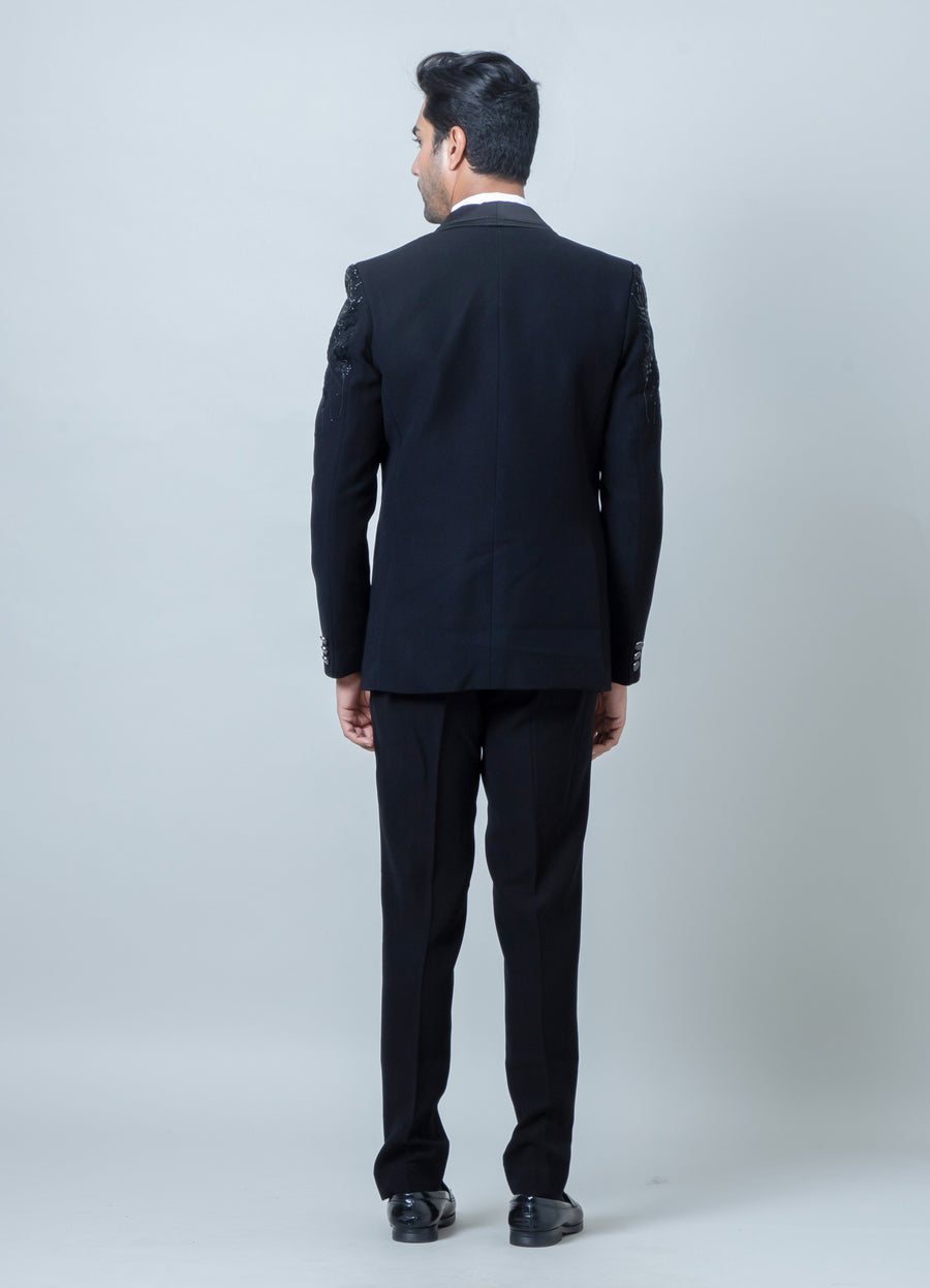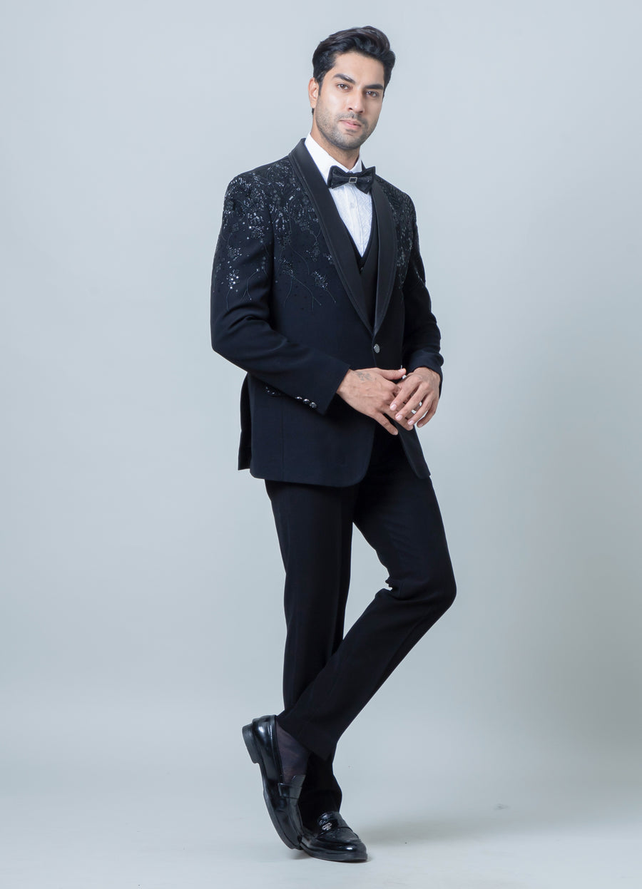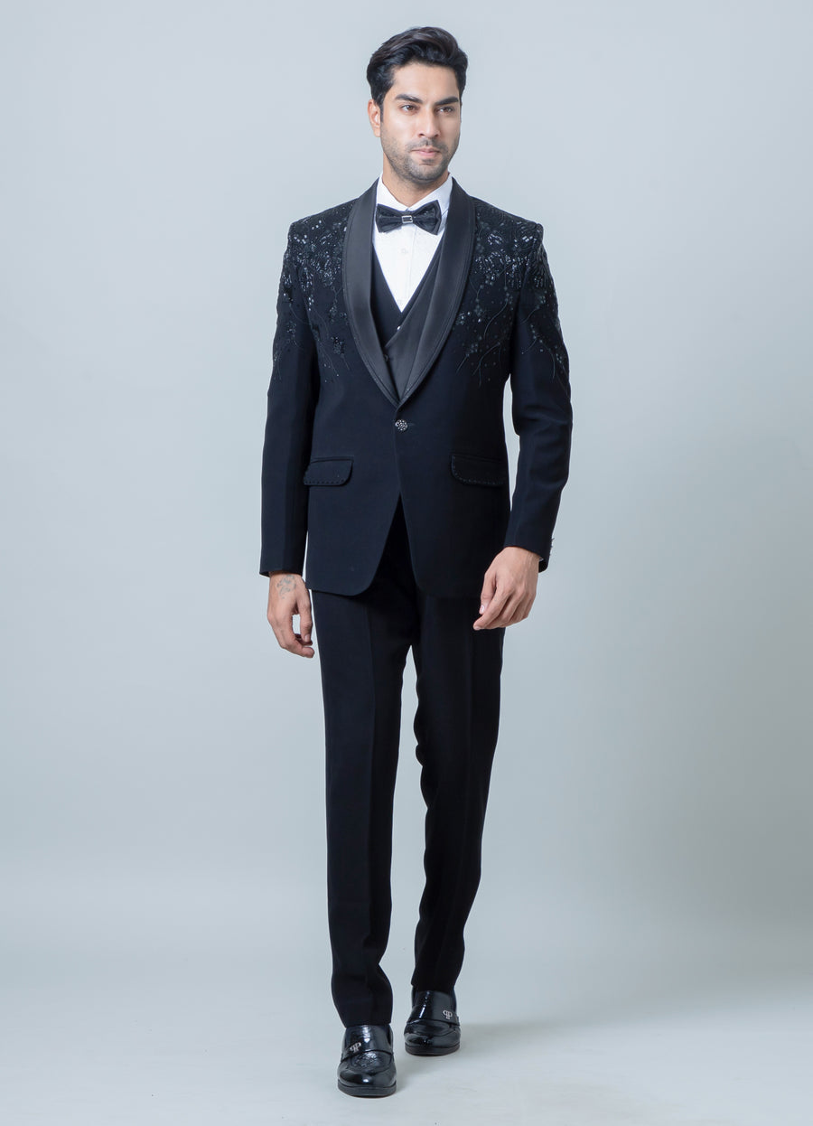 This Tuxedo Suit made from Polynosic fabric offers an exceptional blend of style and functionality. Crafted from high-quality Japanese polynosic fabric, this suit boasts a wrinkle-free finish, ensuring a polished, sharp appearance. It is elevated with a combination of hand and machine embroidery, adding intricate detailing that highlights craftsmanship and attention to detail.