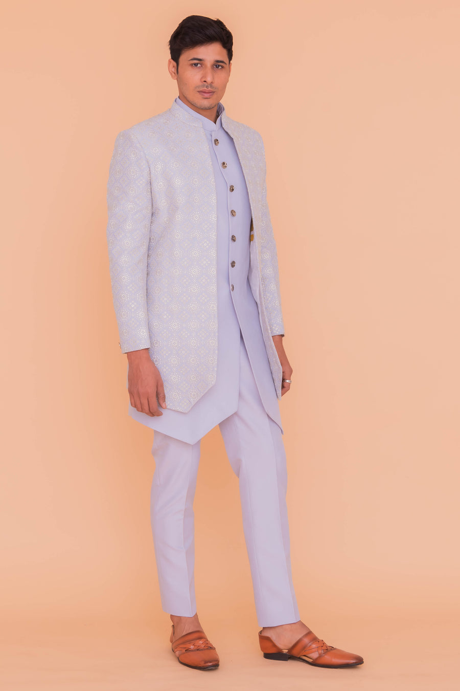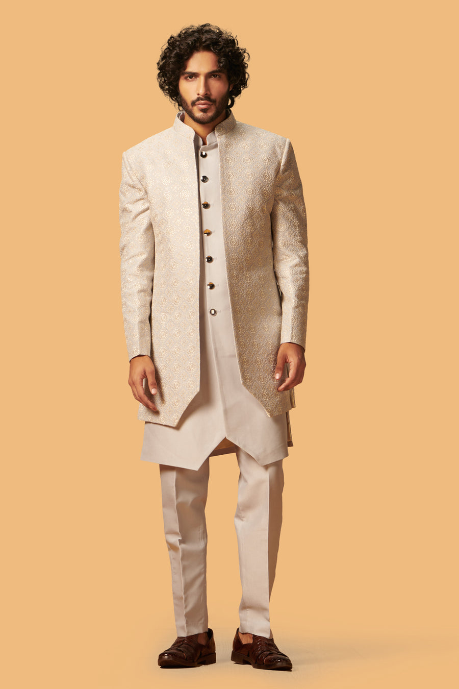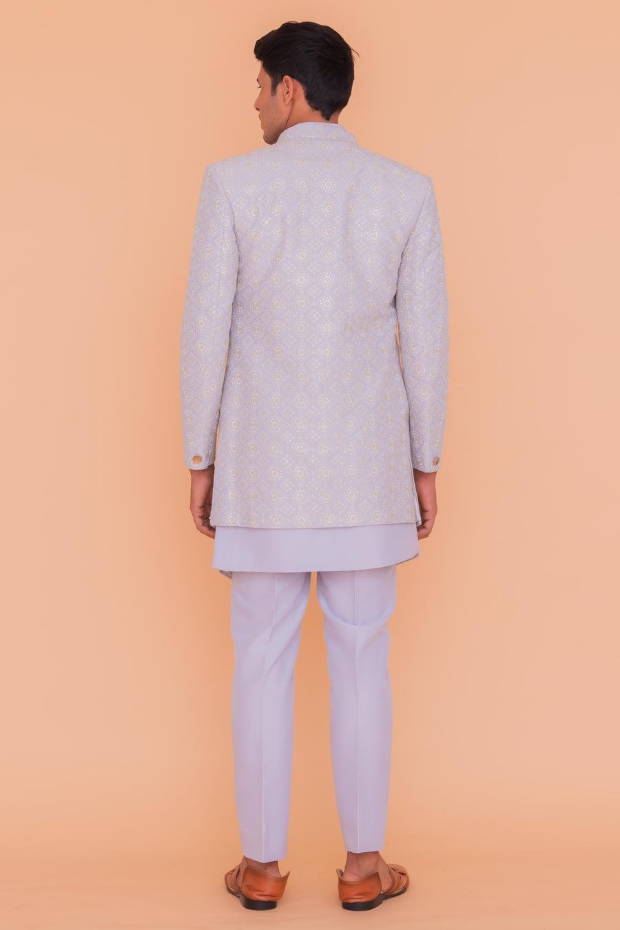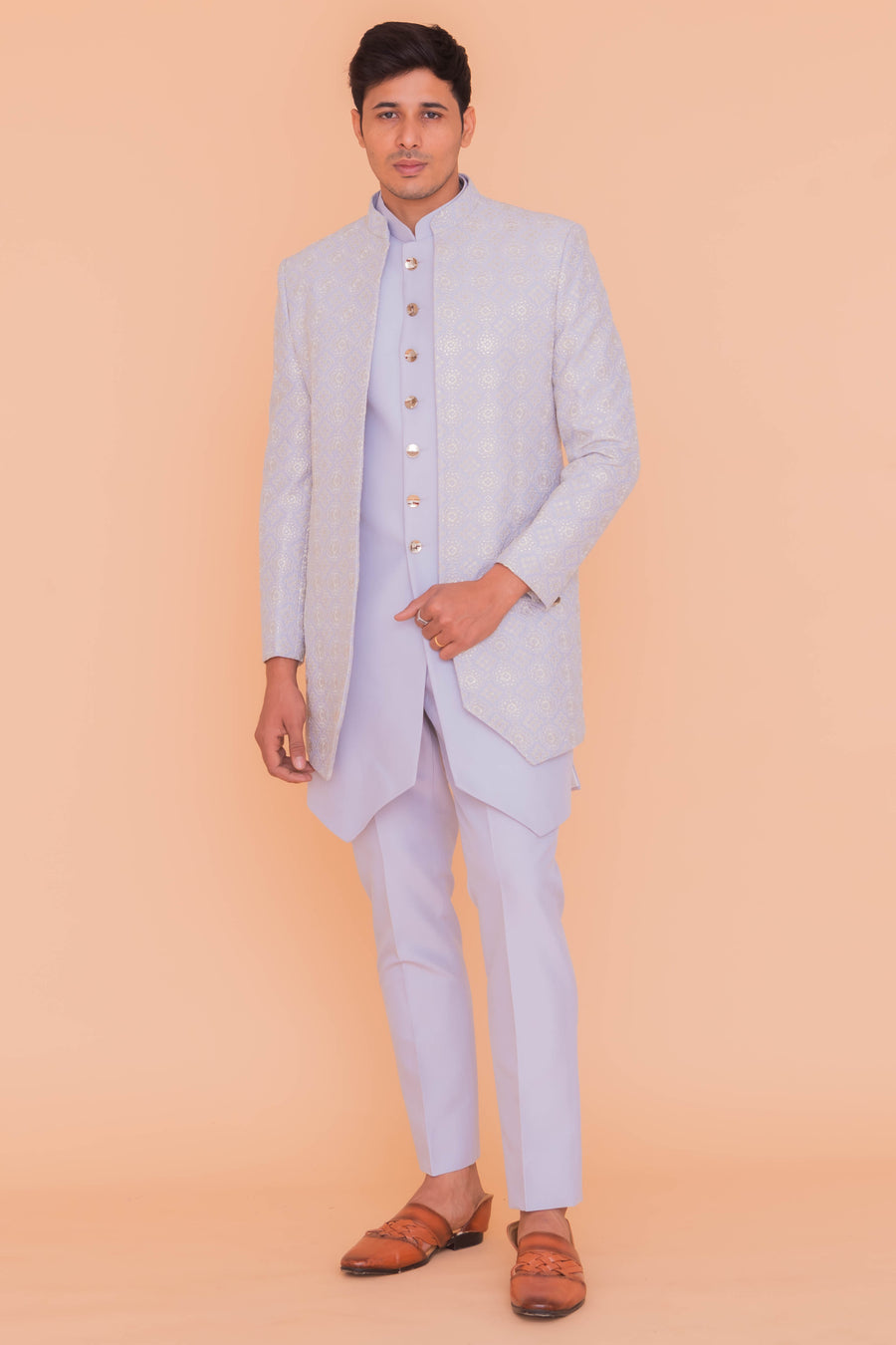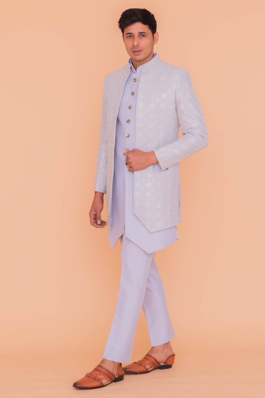 Step out in style with our Indo-Western 2-piece Ensemble Crafted from Luxurious Jacquard Fabric. This stunning outfit Features intricate details that adds a touch of elegance and sophistication. Paired with cotton silk pants, it combines traditional design with a modern silhouette.