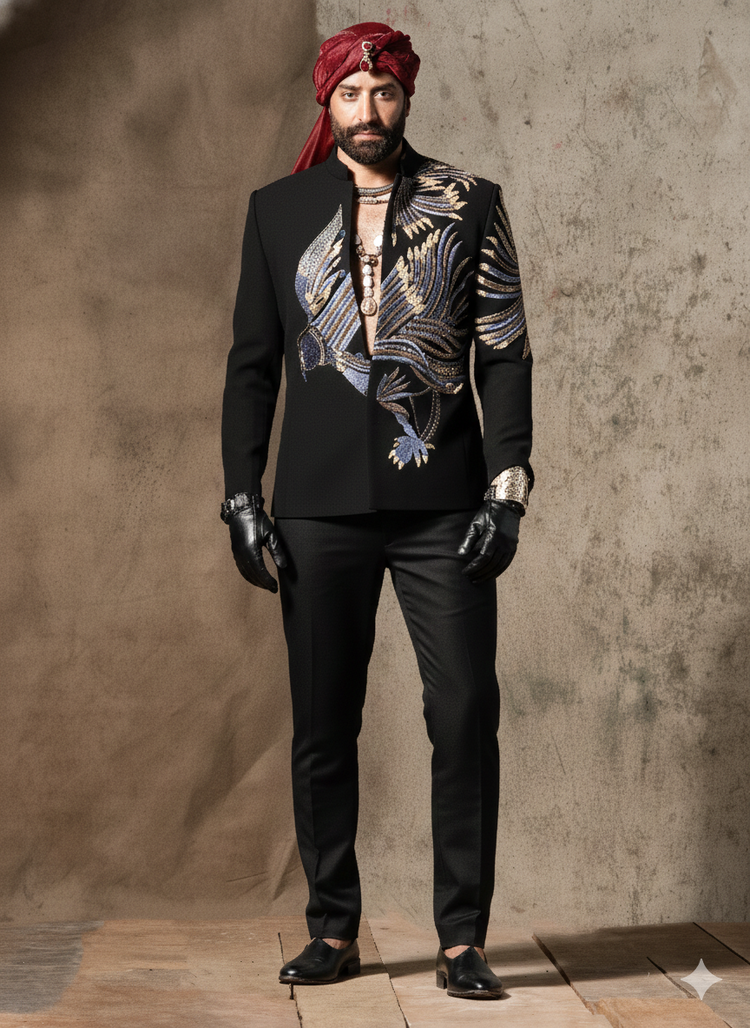 Samrat BLACK Premium Japanese Jodhpuri Suit embellished with Zari work, Resham work, Zardozi, made for noble celebrations.